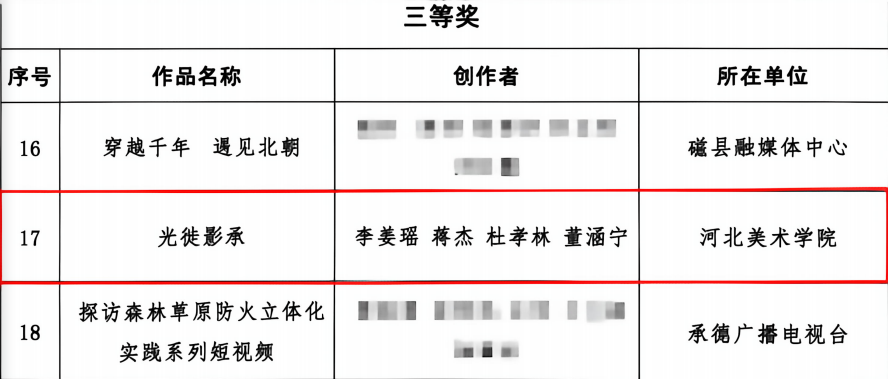 本次活动吸引全省200余家单位和机构积极参与,累计推荐作品近400项。经资格审核、初审、终审等多轮严格评审,由影视摄影与制作专业薛令昆老师指导的我院作品《光徙影承》获评三等奖,充分展现了我院在影视创作实践教学与社会科学普及融合方面取得的积极成效。