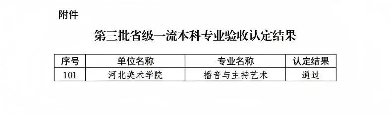 近日,河北省教育厅印发《关于公布第三批省级一流本科专业验收认定结果的通知》(冀教高函〔2026〕11号),公布了2021年度立项建设的认定结果,我院播音与主持艺术专业顺利通过验收认定。至此,我院广播电视编导、播音与主持艺术两个专业全部验收认定为省级一流本科专业。