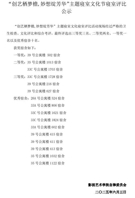 为营造温馨舒适、团结友爱的寝室氛围,定格寝室生活闪光瞬间,营造多元文化氛围,影视艺术学院自律委员会特此举办“创艺栖梦檐,妙想绽芳华”寝室文化节活动。