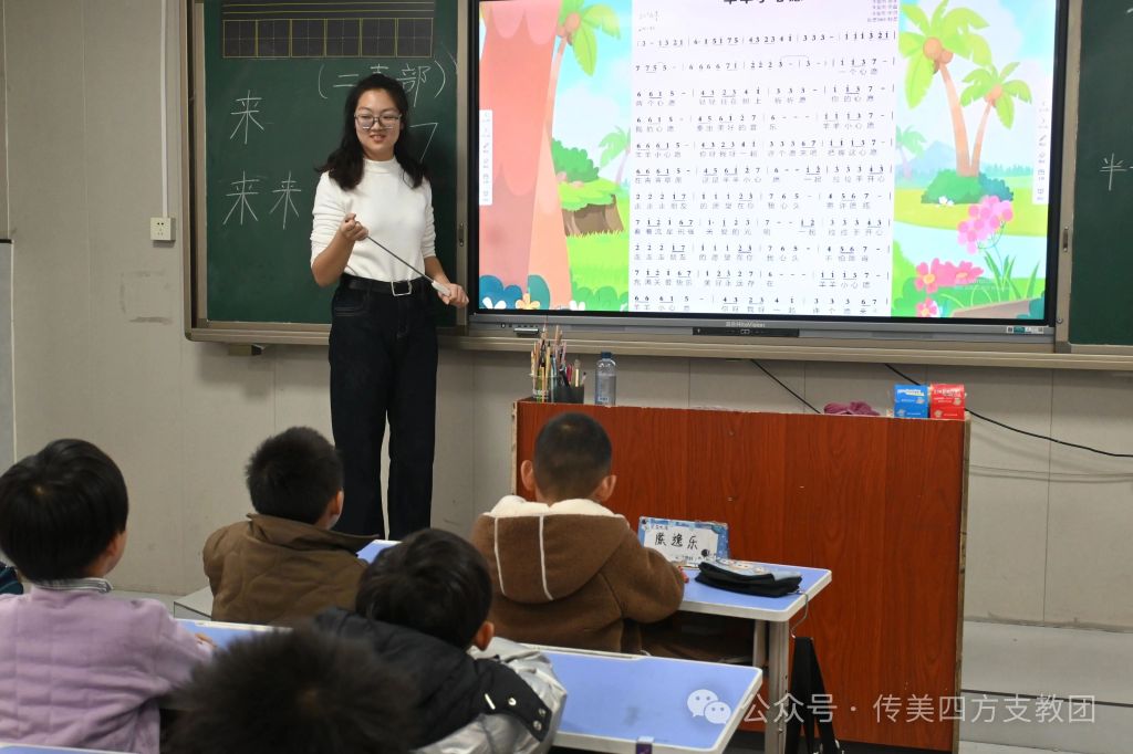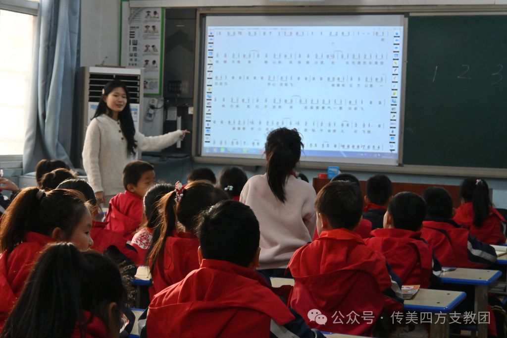 支教内容以“分龄教唱,趣味互动”为核心。一年级的《羊羊小心愿》歌词简单、节奏轻快,适配孩子注意力短的特点;二年级的《歌声与微笑》侧重培养团队协作,简单的二声部合唱让孩子们在拍手互动中学会分享快乐;三年级的《开心往前飞》结合“小鸟飞翔”游戏,鼓励孩子勇敢尝试。
