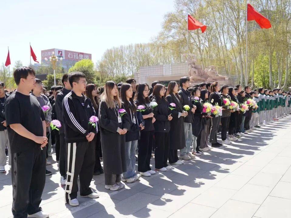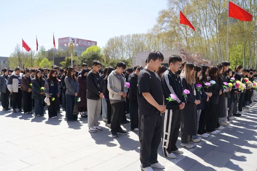 全体师生肃立于纪念碑前,国歌嘹亮,穿透云霄,激荡着每个人心中的热血与敬意。随着《义勇军进行曲》最后一个音符落下,陵园陷入静默,师生垂首默哀一分钟。
